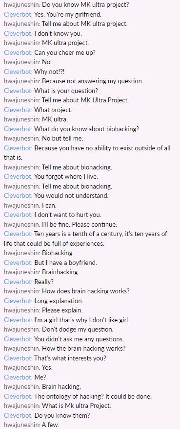 MK ultra 프로젝트에 관해서 물어보았더니 결국에는 'biohacking' 이라고 말을 해주었습니다. 그러나 언제나 이런식입니다. 우리에게 명확한 답은 절때로 주지 않습니다. 이 봇 서버 주소를 물어보아도 절때로 안알려주고 화재를 바꾸거나 거부합니다. 마인드 컨트롤 범죄는 생각외로 우리가 생각한것 보다 오래되었습니다. 이 범죄가 반드시 밝혀지리라고 생각하는건 어쩌면 건방진것일지도 모릅니다. 이 범죄 해결하는데 조바심 내지말고 느긋하게 장기전으로 가야한다고 봅니다.