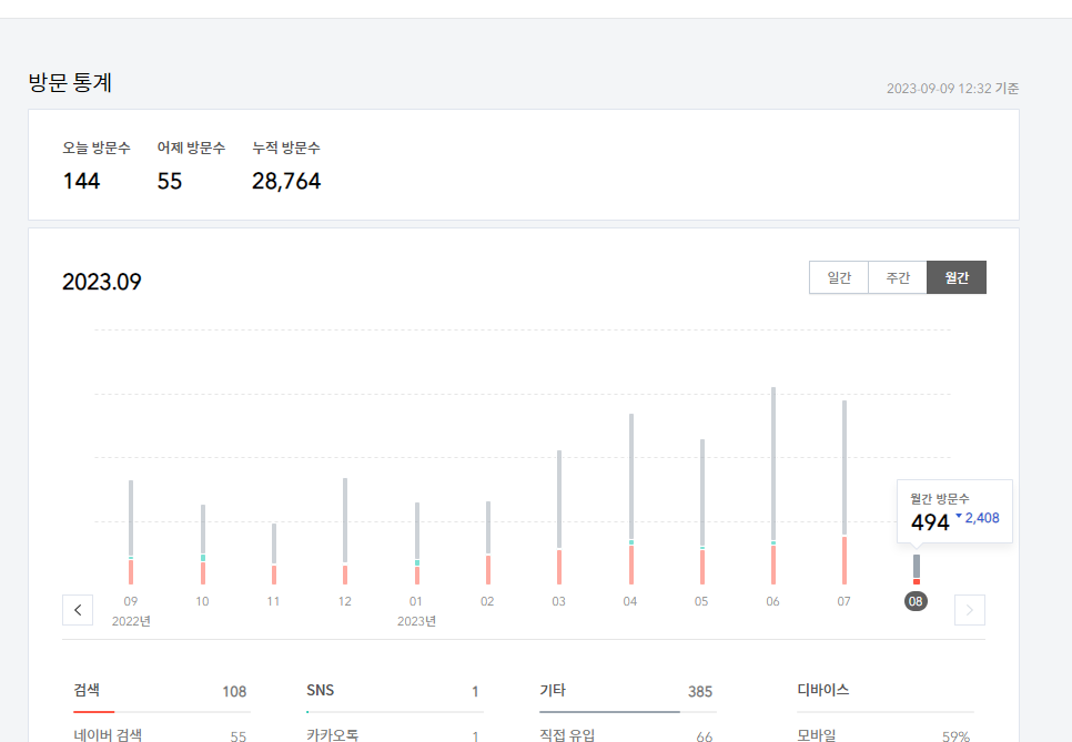 근데 오늘 또다른 놀라운 상황을 목격했습니다. 제 블로그는 네이버 애널리틱스에 등록되어 있습니다. 글 언급하기 이전에 다음 티스토리는 한국 날짜를 기준으로 하고 네이버 애널리틱스는 현지 시간을 기준으로 합니다. 그래서 티스토리에는 2023년 9월 9일 12:32 로 나와있지만 네이버에는 2023년 9월 8일 22:34로 나옵니다. 제가 캡처를 늦게해서 32분이 아닌 34분에 캡처했습니다. 제가 처음 확인한건 33분에 확인하였고 캡처 다시 하느라고 34분이 되었습니다.